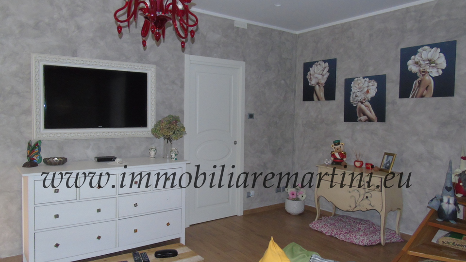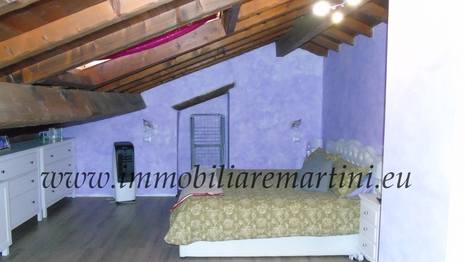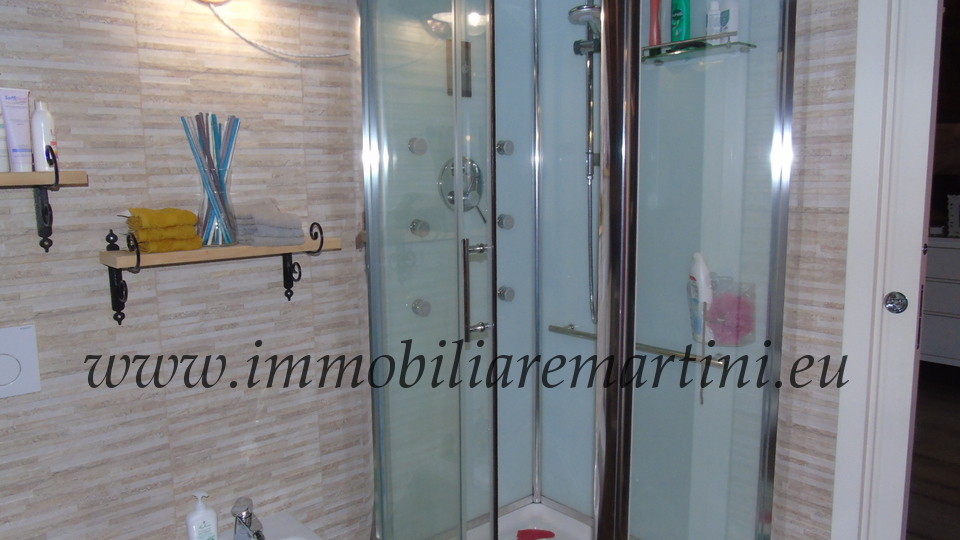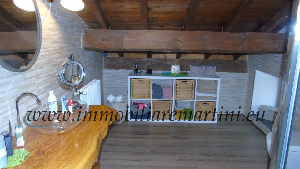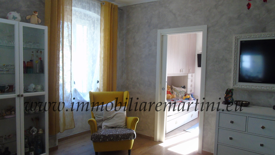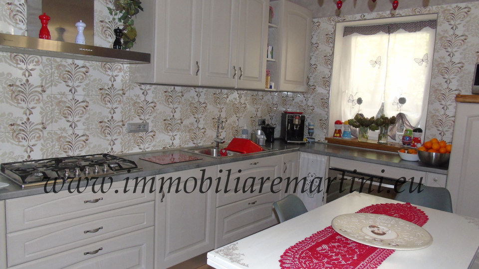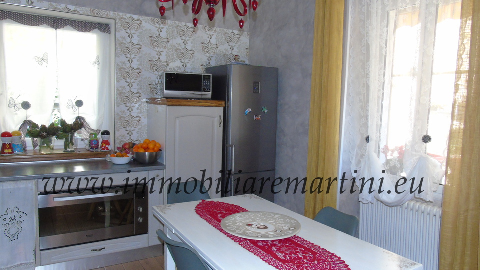 L'appartamento su due piani è composto da cucina e soggiorno, due bagni, 3 camere. Il giardino esposto a sud, di mq 60 con cucina coperta all'aperto. Riscaldamento con caldaia a pelet e gas GPL. Nel centro commerciale del paese. È presente, farmacia, bar, alimentari, ristoranti e pasticceria e negozio prodotti tipici, posta, bancomat. A pochi passi dal parcheggio pubblico, due entrate e massima comodità. L'appartamento ha accesso indipendente.